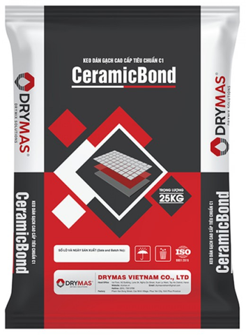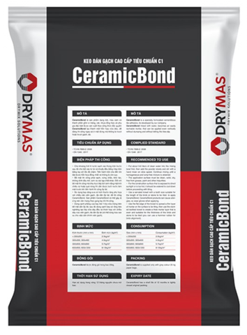 CeramicBond là KEO DÁN GẠCH cao cấp theo tiêu chuẩn C1. Sản phẩm dạng bột, màu xám có thành phần gồm xi măng, cát chọn lọc, nhựa tổng hợp và phụ gia đặc biệt được sản xuất theo công thức độc quyền của công ty DRYMAS. Khi trộn với nước, CeramicBond tạo thành một hỗn hợp vữa dẻo, dễ dàng thi công ngay cả ở mặt đứng mà không bị sụt hoặc trượt gạch. Khi được kết hợp với Latexbond , nó giúp cải thiện độ bám dính và đặc tính chống thấm nước khi đông kết hoặc đóng rắn.